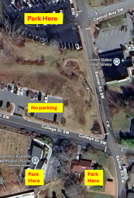 Parkingat Banner Elk UMC can be a challenge. The map below indicates where you can safely park.